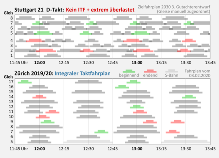 Kein Integraler Taktfahrplan (lTF) im S21-Tiefbahnhof (Umsteigezeiten teils über 50 Min). Extreme Überlastung selbst in der Nebenverkehrszeit. Un­ten: ITF in Zürich Hbf, Umstiege zwischen vielen Zügen während der Haltezeit.